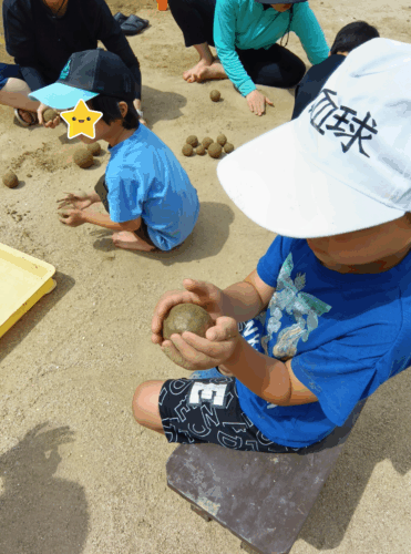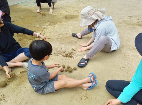 午後のグループは、ピカピカ泥だんご作りにもはまっています。「ここの泥は固まりやすいよ」「サラ粉で作ったらピカピカになるよ」と子どもたちで教え合いながら、お互いに出来た泥だんごを見せ合いっこして、友だちを意識したやりとりが飛び交います。そんな中、自分の子どもの頃を思い出した大人たちの方が夢中でサラ粉を集めピカピカ泥だんごを作っている姿がありました(*^^*)。それを見た子どもたちは、キラキラした尊敬の眼差しで見ています。大人も子どももいっしょになってたくさんの泥だんごをつくりました。