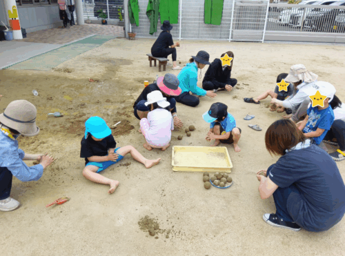 午前のグループは、徐々に水や泥に慣れていくように、お水やさんから水をくんできて流したり、泥を入れて混ぜてお料理したり、しっとりしたあそびから、だんだんと泥だんごを作ったり、それを転がしてみたりと緩やかに遊びます。