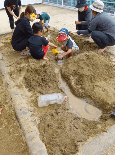 午後のグループは、自分たちで道具を選んで、コースを作り、ジャンジャンお水を流します。あっという間に大きなダムの出来上がりです。ダムの中にトンネルを作ったり、ジャンプ台を作ったり、遊び方は無限大です。友だちと相談したり、協力したり、時には大人に手伝ってもらったり、やりとりをしながら「どんなのが出来るかな?」とワクワクを楽しんでいます。