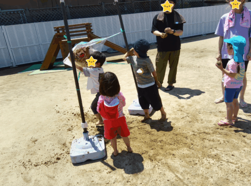 大きいクラスでは、ダイナミックにクッパの的へ向かって、思いっきり振りかぶって「エイッ!!」と泥だんごを投げます。どんどんクッパは真っ黒になり見えなくなってしまうと…今度は救助隊の子どもたちが出動です!お水を持ってきて、きれいに洗ってくれます。「汚すのと洗うのと…さあ、どっちが早いかな?」、大人たちも「助太刀いたす」と泥だんごを作ったり、お水を溜めたり大忙しです。「早くやりたい」という子どもたちの思いに大人が一緒になって楽しむことで「もう一回」と楽しみに繋がってきています。