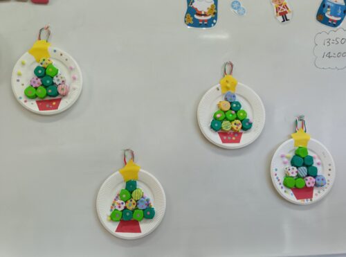 午後のクラスもクリスマス製作をしました。ペットボトルのキャップを使ってクリスマスツリーをつくりました。