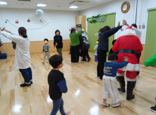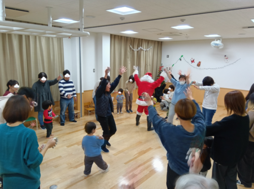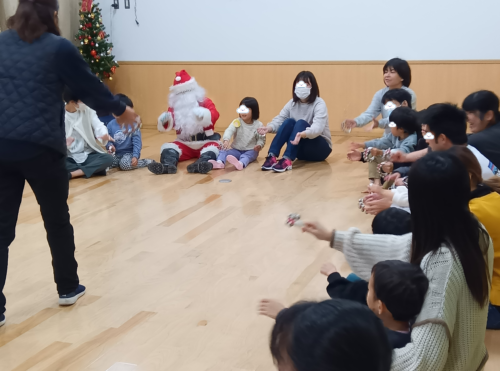 “サンタクロースと一緒に遊ぼう!” では、ミュージック・ケアで 「ギリギリ」「オブラディオブラダ」の曲に合わせてを鈴を鳴らしました。サンタクロースも手首を動かして楽しそうでした!