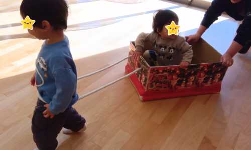 午後クラスでは、転がしドッチが始まりました。少人数でも楽しめる遊びの一つです。取り組み始めた頃は、一度手にしたボールを抱え込んでしまったり、ボールを転がさずに投げてしまったりしていましたが、回数を重ねるごとに、だんだんルールがわかるようになり、ボールに当たらないように逃げる、ボールを素早く転がして当てる、という姿に変わりつつあります。