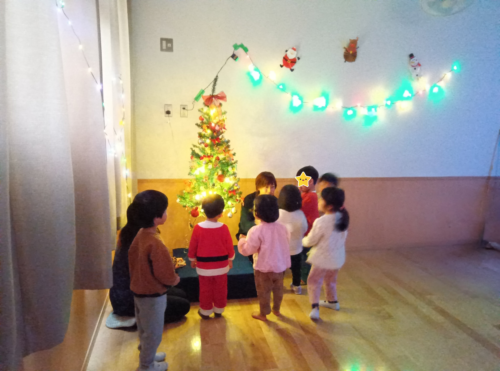 先生がもっている魔法の杖で、「ちちんぷいぷいのぷい~!」とみんなが声をかければ、イルミネーションがどんどんついていきます。クリスマスツリーが点灯すると、「きれいだね~」とみんなの声と目がキラキラ輝いていました。