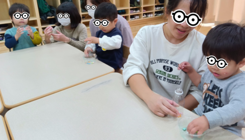 1、2歳児のクラスでは、クリスマス製作でマラカスをつくりました。空き容器の中に、キラキラした小さいビーズを入れていきます。小さいので指でつまむのは難しいですが、みんな集中して一粒ずつ入れていました。活動が楽しければ、いつの間にか手先を使っています。ちょっと苦戦しながらも、出来上がりを楽しみにじっくりと取り組みます。