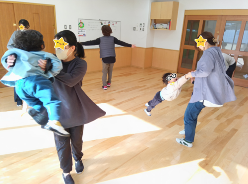 大好きなお母さんと手をつなぎあったり、音楽に合わせてビュ~ンと身体を回してもらったりします。子どもたちも足をピンと伸ばして楽しそう!。お母さんは目が回りそうになりますが、我が子のうれしそうな表情を見ればなんのその。