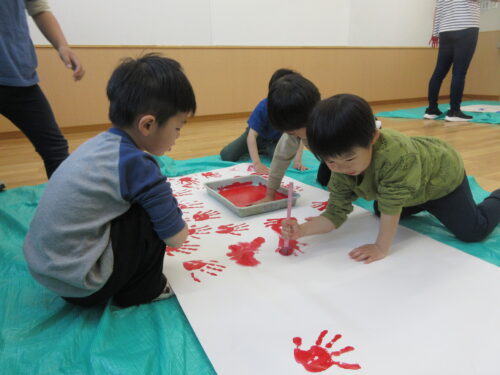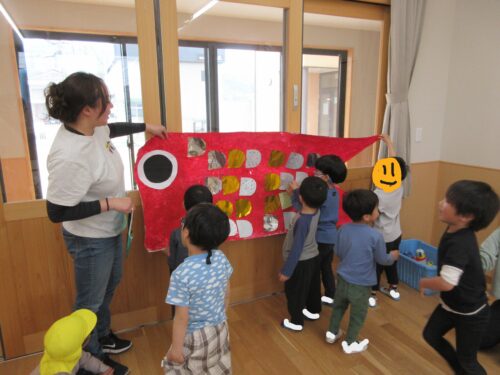 さて、先日5月に向けての『鯉のぼり製作』をしました。大きな鯉のぼりの形の模造紙に絵の具でぬたくりをしたり、一人ずつの小さな鯉のぼりを作ったりしました。ぬたくりでは、手にいっぱい絵の具をつけてペタペタとたくさん塗りました。自分たちでどっちの色がいいか選んで作ったこともあり、白い所が見えなくなるまでしっかり塗って作っていました。