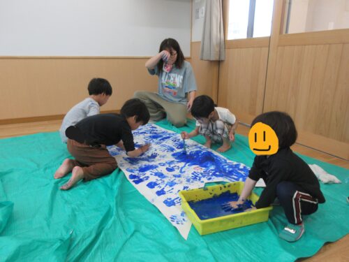 青チームも手を使ったり、うっかり顔につけてしまったりしながら作ることを楽しみました。たくさん塗ったことで子どもたちも出来上がりを楽しみにしており、『デキタ』『ヤッタ』という手応えを感じていました。