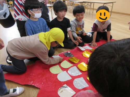 後日、みんなでウロコと目を貼りました。「どんな向きで貼るかな?」とウロコを貼る向きを考えながら、一枚ずつ貼っていきました。