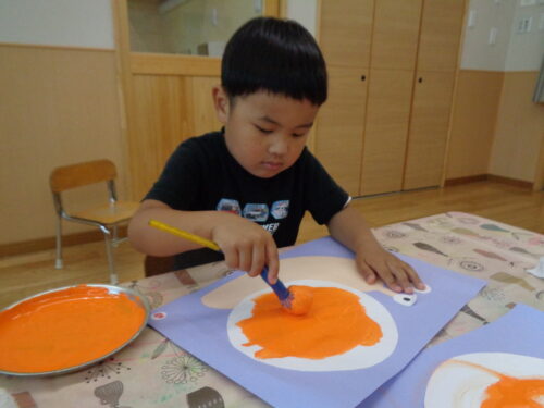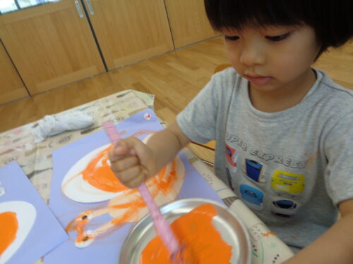 かたつむりの殻にタンポとシール貼りで模様を付けました。