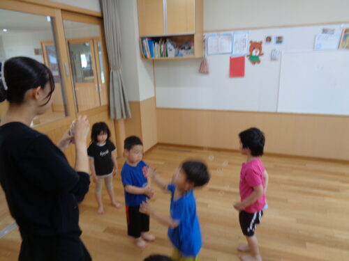 しゃぼん玉のいつも曲が終わると「大キイノ!」と、“大きいしゃぼん玉して~”と伝えてくれます。「ワァ~」と言いながら目を輝かせているみんなです!