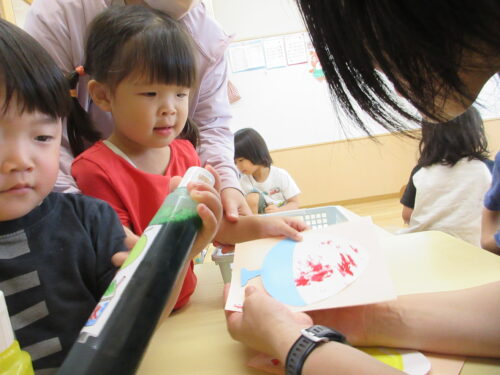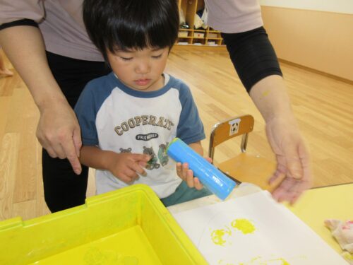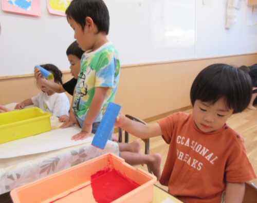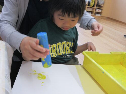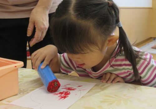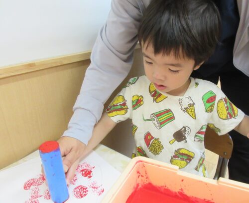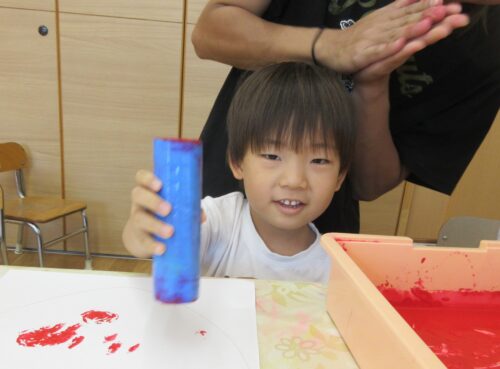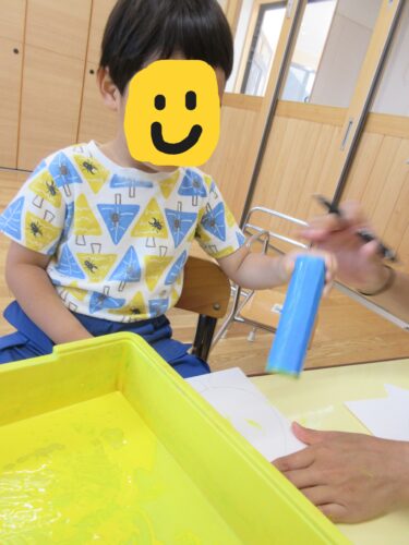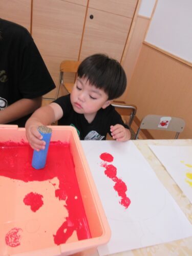 先日、りす組では夏の風物詩『かき氷』の製作をしました。今回はタンポではなく、身近な素材である段ボールを用いました。クルクルと丸めて、握りやすい太さにしてスタンプの完成!段ボールの断面を使うことでおもしろい形が浮かび上がってきました。