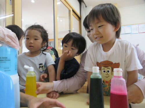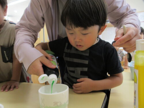 プールに入る日はおやつがかき氷になります。食べ物からも夏を感じていきたいと思います。