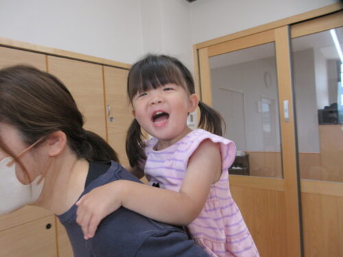 毎日繰り返していく中で曲が流れると、職員に目線を送る子も増えてきて、近くに寄ってアピールしてきたり、誘い掛けると嬉しそうに背中に乗ってきたりするお友だち、一緒に走るお友だちも増えてきています。