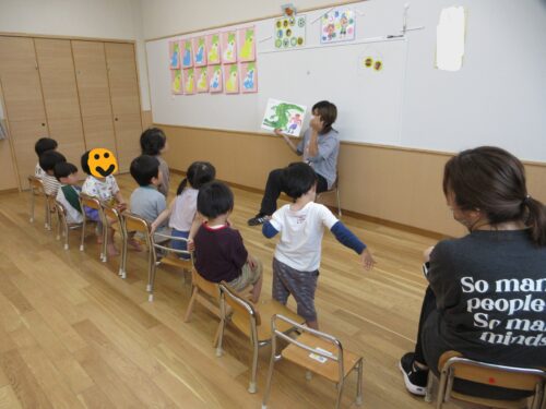 最近では、「できるかな」が大好きなお友だちも多く、お集まりにも取り入れています。好きな絵本を楽しみに、椅子に座りに来る姿も増えてきました。お話を見ながら動物の真似っこもしていますよ。