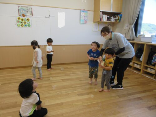 活動の始めはしゃぼん玉から始まります。しゃぼん玉は好きなお友だちも多く、目を輝かせていたり、「ワァ!」と声を上げて喜んでいたりしていますよ。