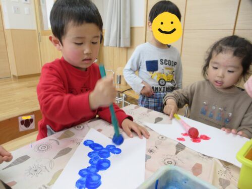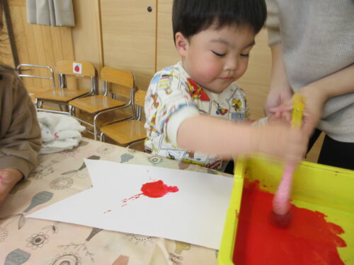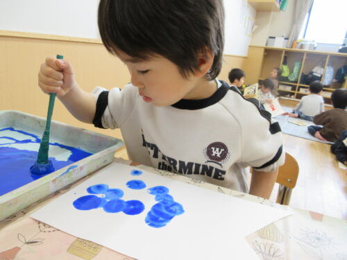 自分たちで決めた色をちょんちょん付けて、みんな夢中でポンポンしていますね! 新入園のお友だちはひかり園で初めてする製作に興味津々! 在園のお友だちがしているのを “いいなー” と眺める子どもたちです。