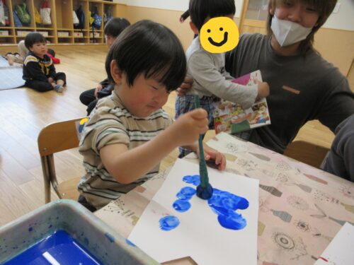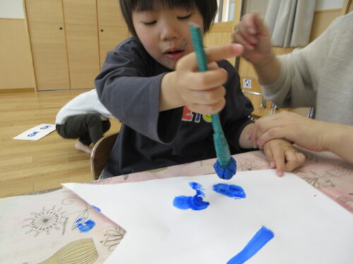ただポンポンするだけでも、自分で色を決めて、しっかり握る、絵具をつける、ずれないように押さえる、色が薄くなったらまた色を付けなおす…などなど工程はたくさん。世界に一枚のこいのぼりが完成しました。教室に12匹のかわいいこいのぼりが泳いでいますので是非見てみてください!