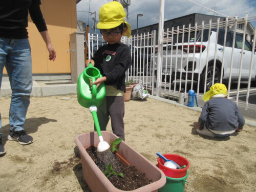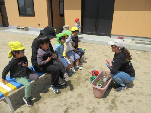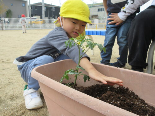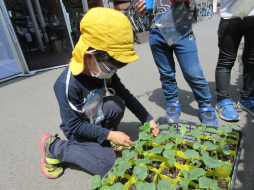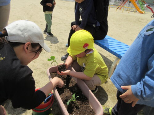 後日、苗植えをしました。今回は、前日に買ってきてくれたトマト・ピーマン・キュウリの苗をグループに分かれて植えていきました。おあつまりの時に、グループ発表をし、自分の担当の野菜のマークを胸に貼って、どの野菜を植えるか確認しました。園庭では、外あそびをしながら、グループごとに順番に植えていきました。