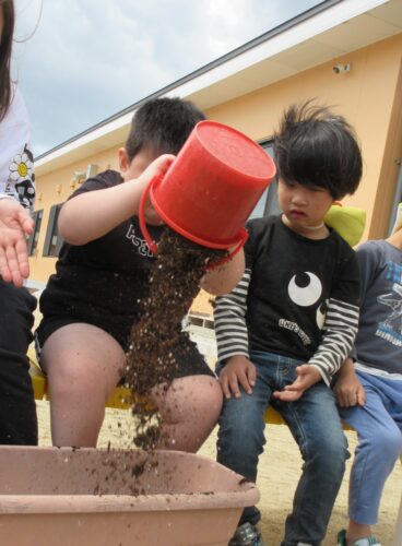 次にポットから苗を取りだし、プランターに植えてから砂のお布団をかけてくれました。