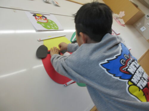 獅子舞のイラストと見比べたり、「もっと上、上」、「横かな~」という周りの声を手がかりにしたりして、素敵なお顔が完成しました。