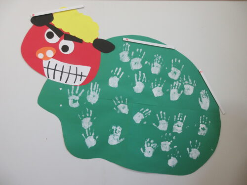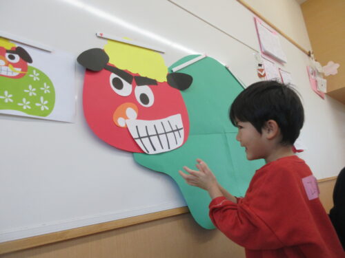 1人に一つ(目、眉毛、鼻、口、耳)パーツを渡して“福笑い風”に遊びながら貼りました。