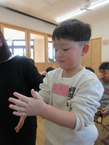手のひらを広げ、腕を伸ばし、「3・2・1、ペッタン!」という