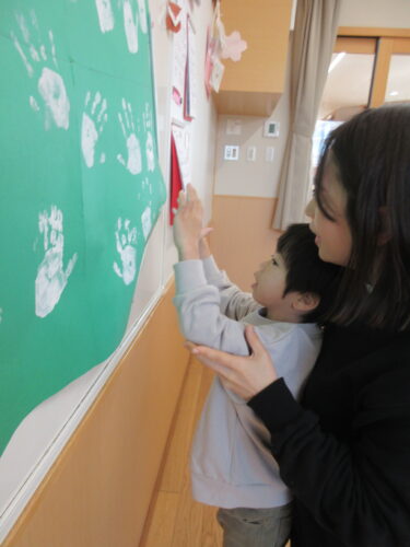 職員の「パッ」というかけ声で手を離すと、自分の手形が現れ、ニコニコのうさぎ組さんでした。