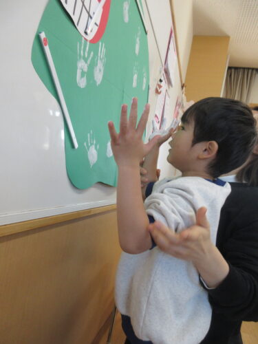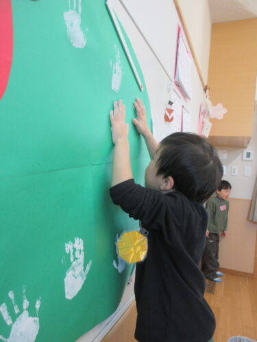 職員の「パッ」というかけ声で手を離すと、自分の手形が現れ、ニコニコのうさぎ組さんでした。