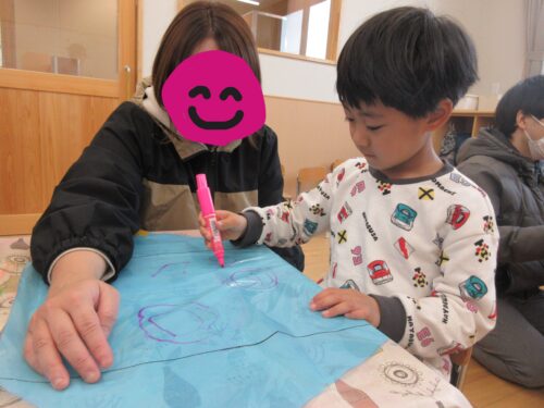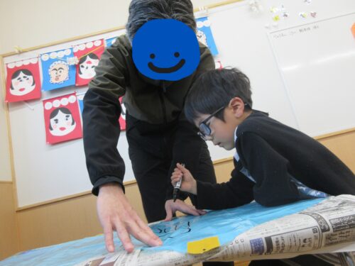 絵が描き終わると、家族の方に手伝ってもらいながら凧ひごをあらかじめ書かれてあった線に合わせてセロテープで張り付け、凧糸を括りつけて出来上がり!!