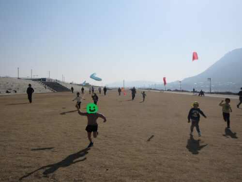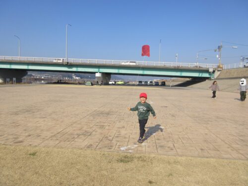 土手についたら、広い土手をみんなで走って凧あげをしました。