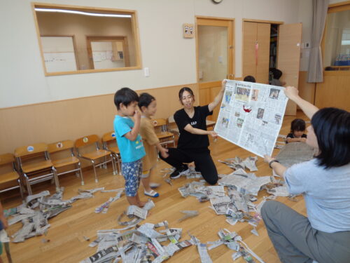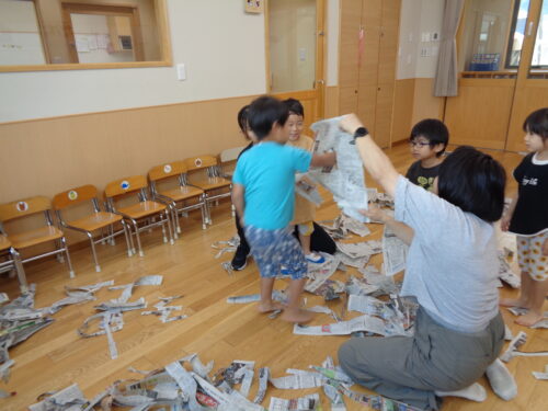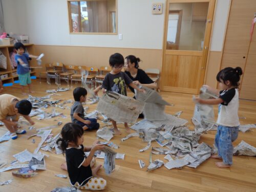 くま組ではプールのない日、教室で『プールごっこ』をしています。新聞紙を水に見立てて遊びました。まずは大きな1枚をちいさくちぎっていきます。