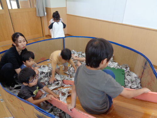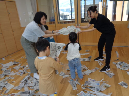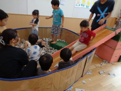破った新聞紙をあつめて、囲いの中に入れました。プールに見立てて室内ウォータースライダー!たくさんの新聞紙の海の中に、滑りこんでいきます!「3,2,1」の掛け声に期待を向けて、順番どんどん滑っていきます。滑った後にはたくさん新聞紙をかけてもらっていい笑顔をみせてくれていますよ。