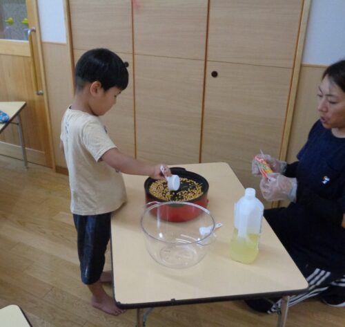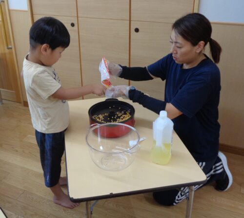 みんなで皮を1枚ずつむいてから蒸して食べたり、タンポでとうもろこしの絵をポンポンと色塗りしたり・・・そして、今回はポップコーンに挑戦しました。