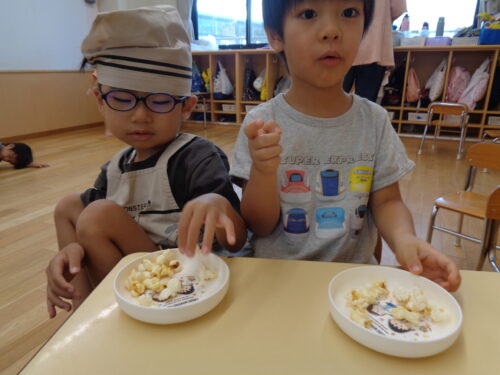 だんだん楽しい見通しになって、“やってみよう”と自分から向かってきたり、遠くにいた子がポップコーン機のそばに来たり、“食べてみようかな…”と初めてポップコーンを食べるなど…様子が変化していきました。
