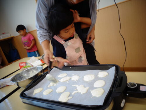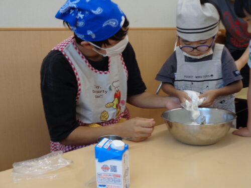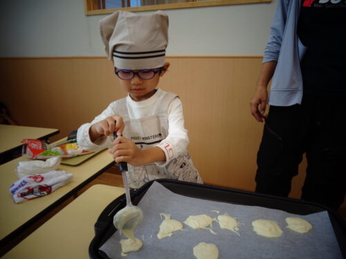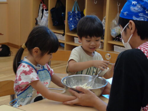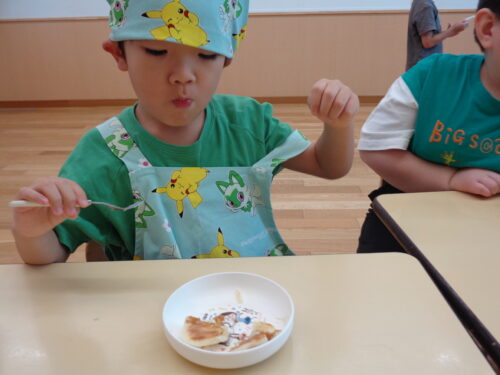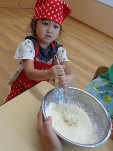 “やりたいやりたい”と手をあげたり、名前を呼ばれてうれしそうに前に出てきたりなどクッキングに気持ちを向けて取りくむ姿がたくさん見られました。