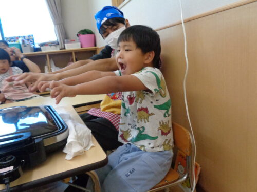 ふたを開けるたびにワクワクした表情で覗き込み、ぷつぷつと泡が出てきたり色がついたりなどの変化を楽しみました。いい匂いがしてくると少し後ろの方で見ていたお友だちもだんだんとつられて前に近づいてきます。