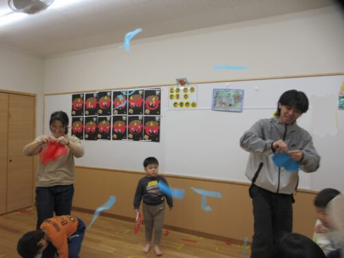 今回は親子リズムで新聞紙をビリビリして遊んだ時の曲、『ハンガリー舞曲第5番』にのせて花紙あそびをしました。