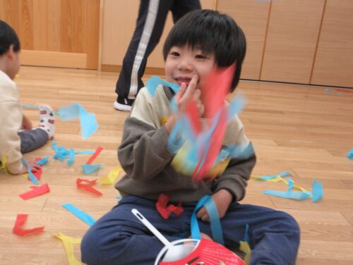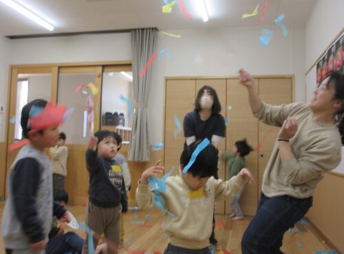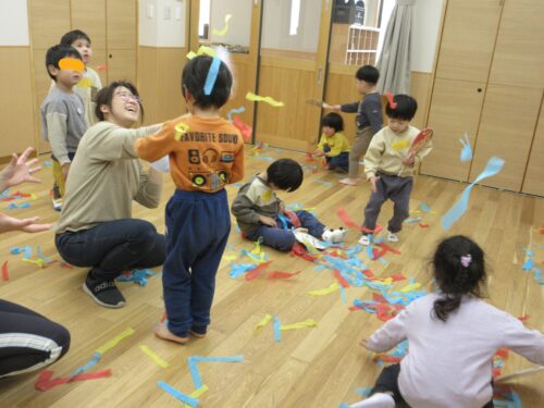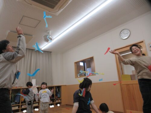 子どもたちはヒラヒラと舞い上がっては落ちる様子を見ながら、曲の持つ独特の雰囲気も一緒に味わいました。