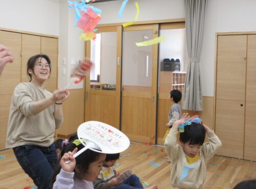 先生がリズムに合わせて、音楽の強拍(1拍目)のタイミングで花紙をちぎり、1小節の終わりで投げます。