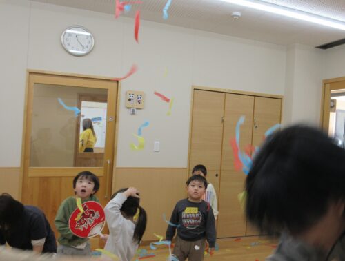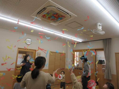「3・2・1」の掛け声に合わせて、花紙が空中を舞います。
