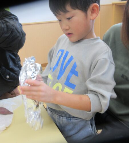 おいもを洗って、新聞紙・アルミホイルに包んで、焼く準備も自分たちでします。