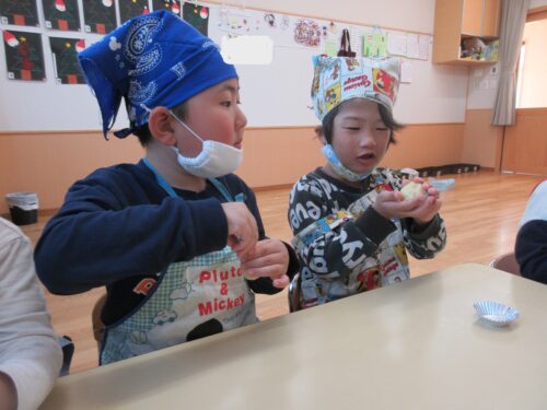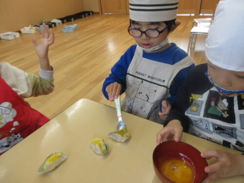 中には、食べることはちょっぴり苦手…という子もいましたが、それでも自分で作ったという手応えになったようで、満足そうな表情でしたよ♪