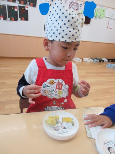 さて先日は、レインボースターズグループではさつまいもを使って、“スイートポテト”を作りました。クッキングに期待して、自分からエプロンやバンダナを着て準備を始め、ワクワクしながら向かっていました。