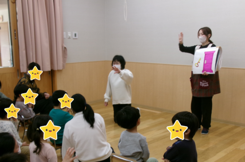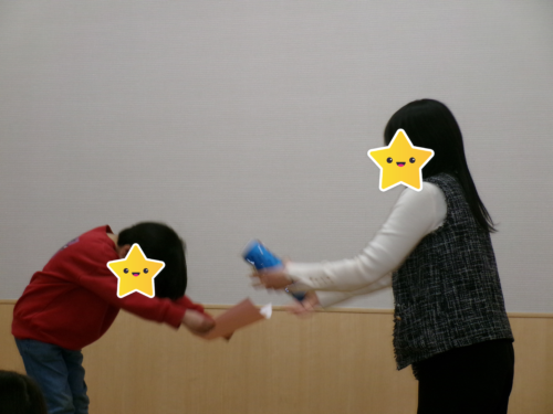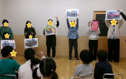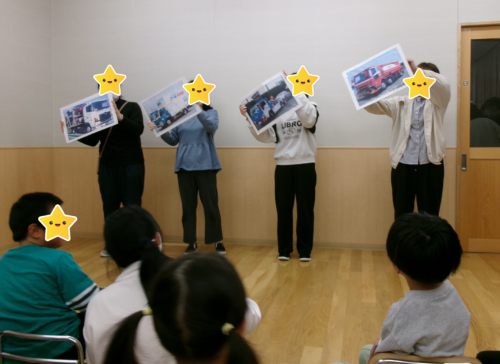 ◇続きまして、職員と保護者による出しもので『はたらくくるま』です。乗り物のパネルを持って登場!「あ、ぼくのママだ!!」こどももおとなもみ~んな笑顔。