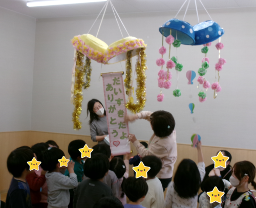 お別れの時期が来ました。ひまり園では全13クラスのお別れ会がおこなわれました。4月に出会って、一年間一緒に遊んだ仲間と、楽しかった出来事をみんなで振り返る時間を過ごしました。