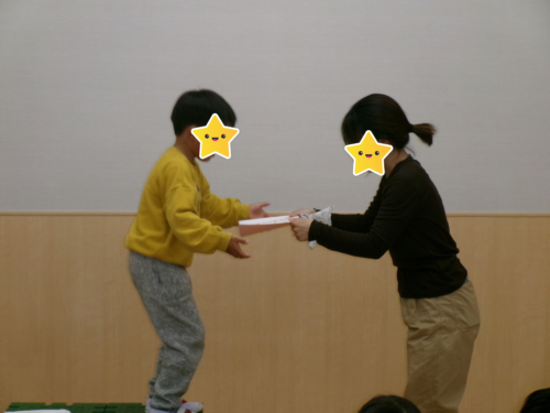 ◇年長さんのクラスでは、おうちの人から賞状のプレゼントがありました。みんなの前で親子で向き合う場面では、なんだか照れくさいなあと感じている子どもたちとは対照的に、大きく育った我が子を改めて感じているおうちの方の姿がありました。