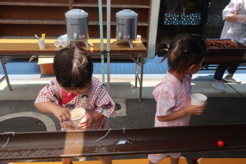 昼食では普段しない流しそうめんに大はしゃぎです。流れてくるそうめんやトマト、さくらんぼを必死になって取っている姿がとても可愛らしかったです。その他にもフランクフルトや焼き鳥、イカ焼き等いろいろメニューがあり嬉しそうにしてお腹パンパンになるまで食べていました。デザートにはかき氷機でかき氷を作り、暑かったのもありお替りをする子もいて大人気でした。
