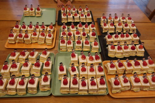 目の前に沢山のケーキが並べられると、子どもの中には顔を近づけてケーキの匂いをかいでいる子もいれば、指をケーキに近づけて今にも食べたそうにする子もいて、どの子も待ちきれない様子です。