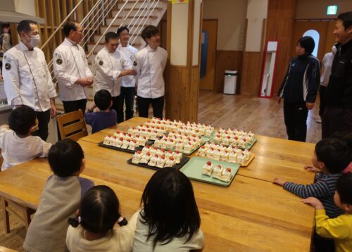 今年は12月11日に一般社団法人 全日本司厨士協会から5名の方々がご来園下さり、一足早く沢山のクリスマスケーキとジュースをプレゼントしてくださいました。